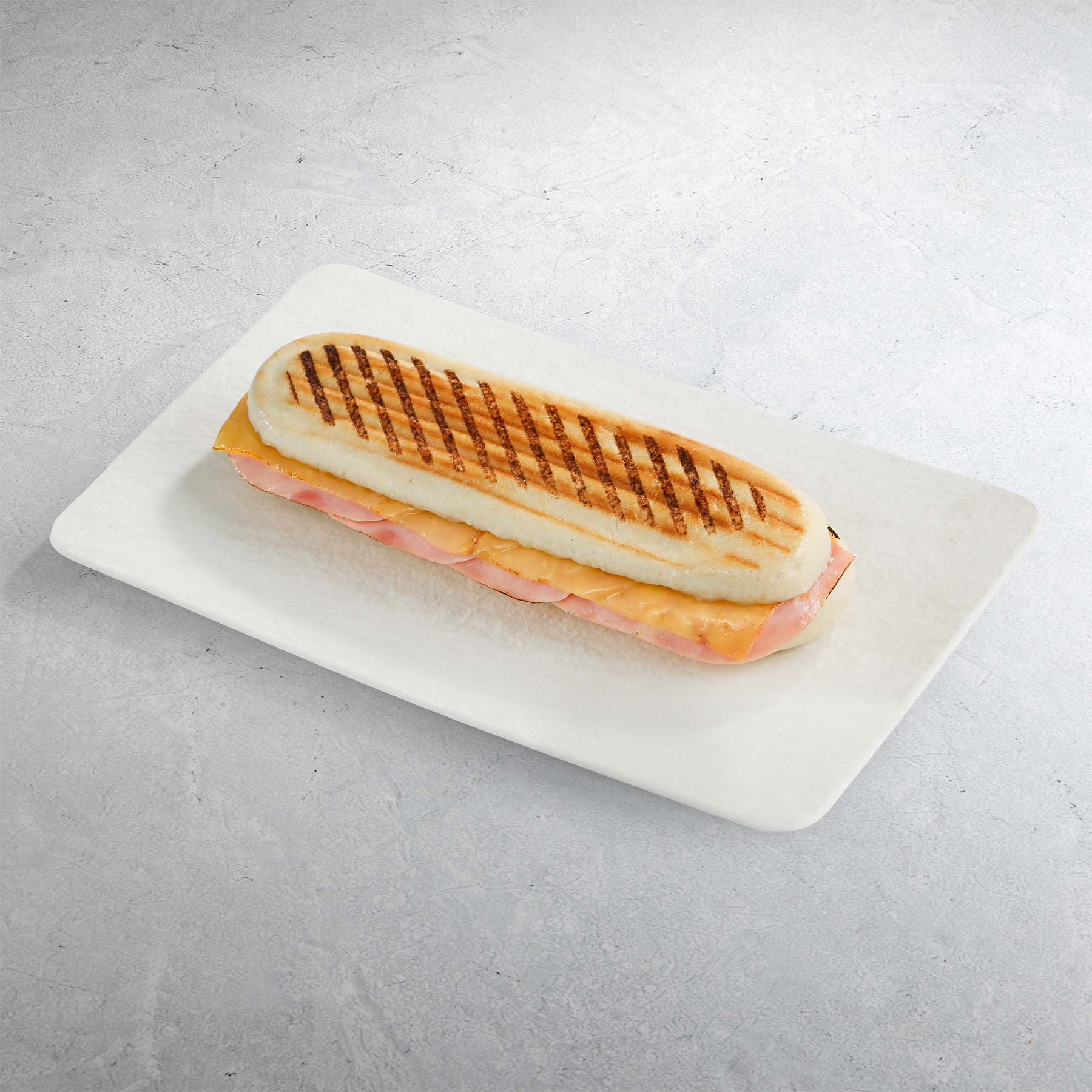 Bun with a crispy texture, spread with butter, filled with ham and cheese and toasted. The rich flavors of the filling perfectly complement the soft interior and crispy crust, creating a unique and satisfying meal.